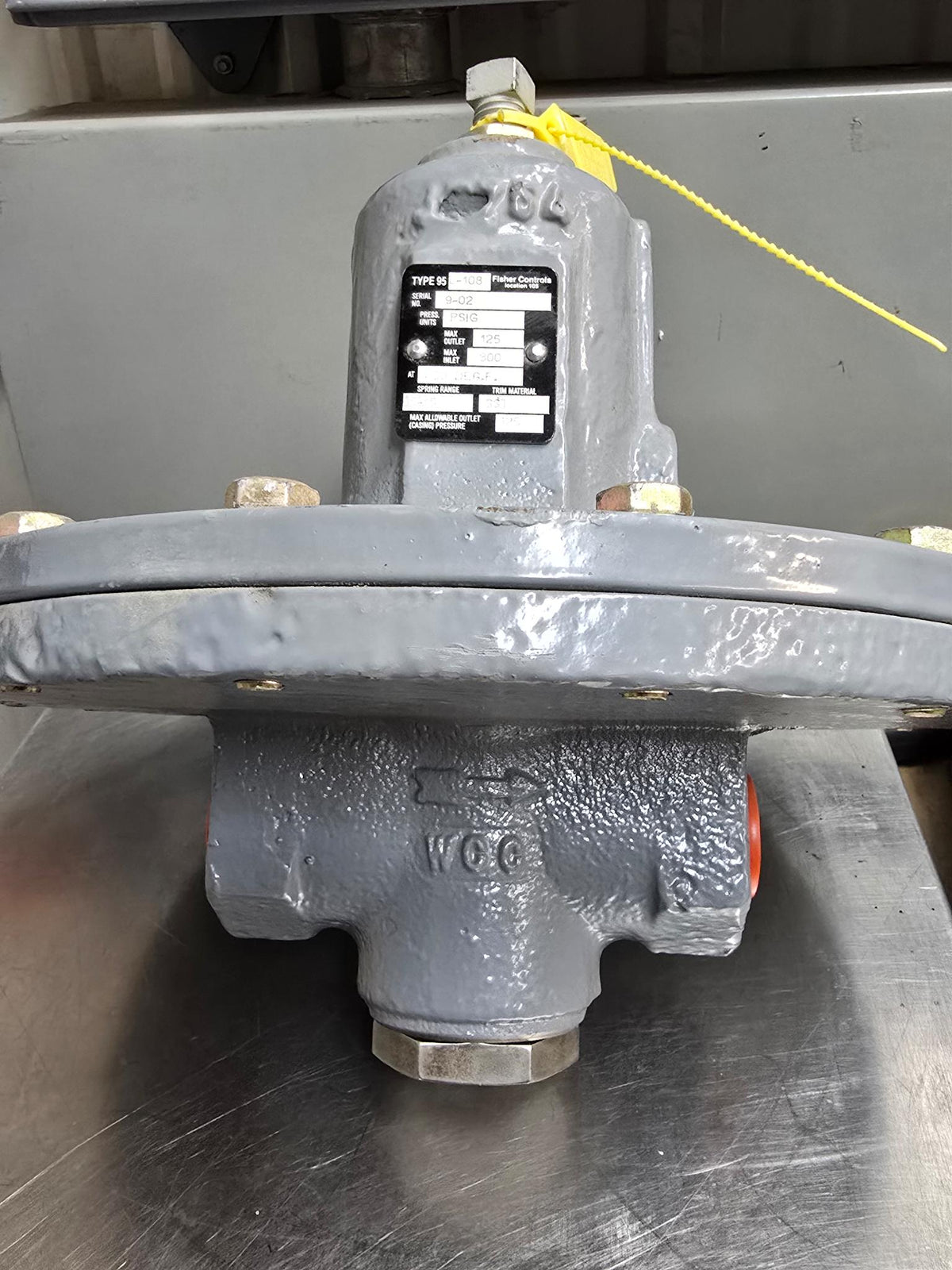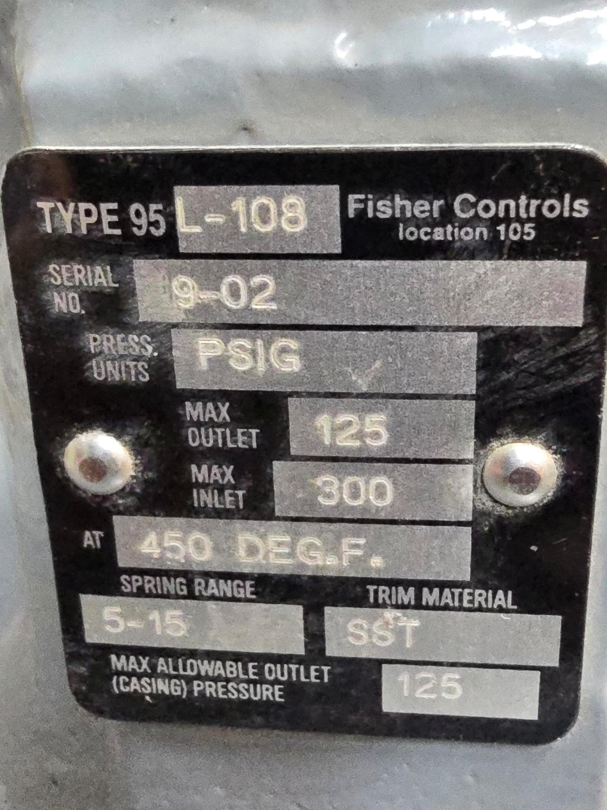 FISHER 95L-108 INDUSTRIAL PRESSURE REGULATOR, MAX OUTLET: 125PSI @ 450 DEG F, MAX INLET: 300PSI @ 450 DEG F, SPRING RANGE: 5-15, TRIM MATERIAL: SST
