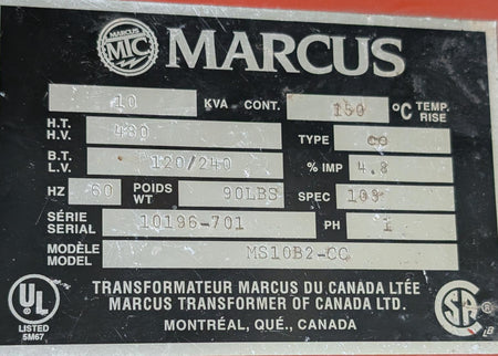 Marcus 10 KVA Transformer, 1PH, 480v to 120/240v - MS10B2-CC -No Enclosure