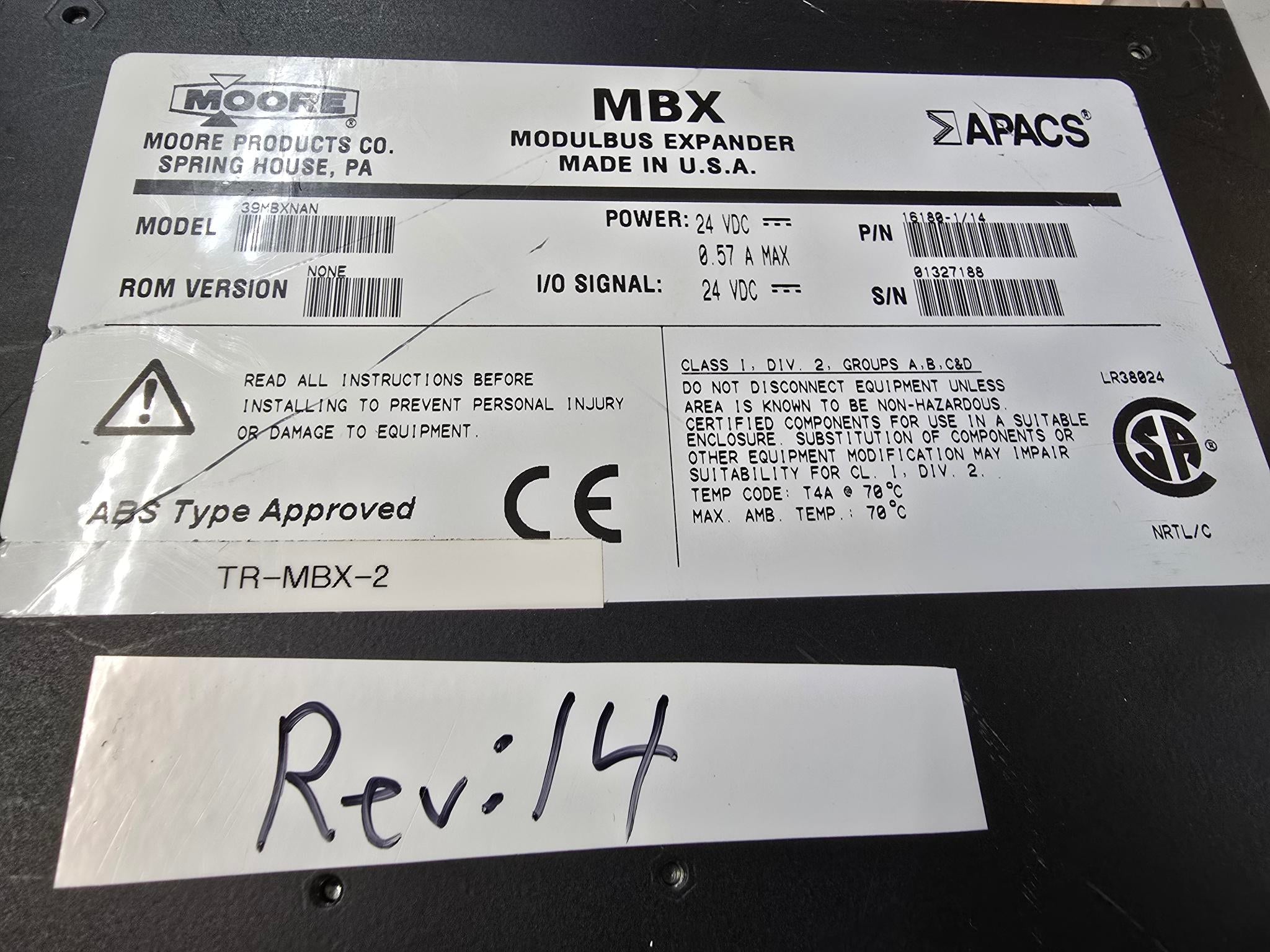 MOORE 39MBXNAN APACS, REV: 14, MBX MODULBUS EXPANDER, 24VDC 0.57A MAX (Used)