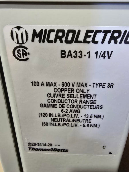 THOMAS & BETTS Microlectric BA33-1 1/4V Single Position Meter Socket 100 A MAX-600 V TYPE 3R