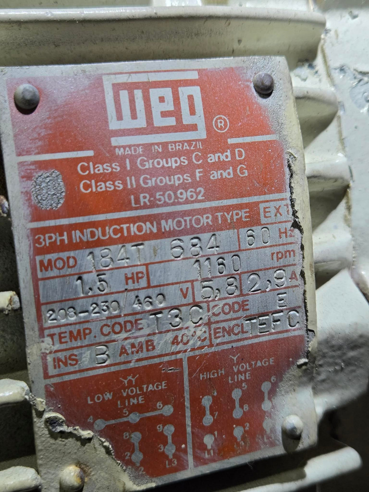 WEG Electric EX Motor 1.5 HP - 208-230/460V- 3PH - 1160 RPM - FR 184T- TEFC EX1